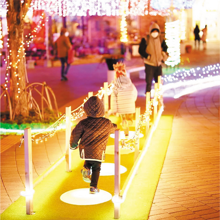 フォトスポットにぴったりなオブジェや、乗ると色が変わる床面に設置されたイルミネーションも楽しんで。
