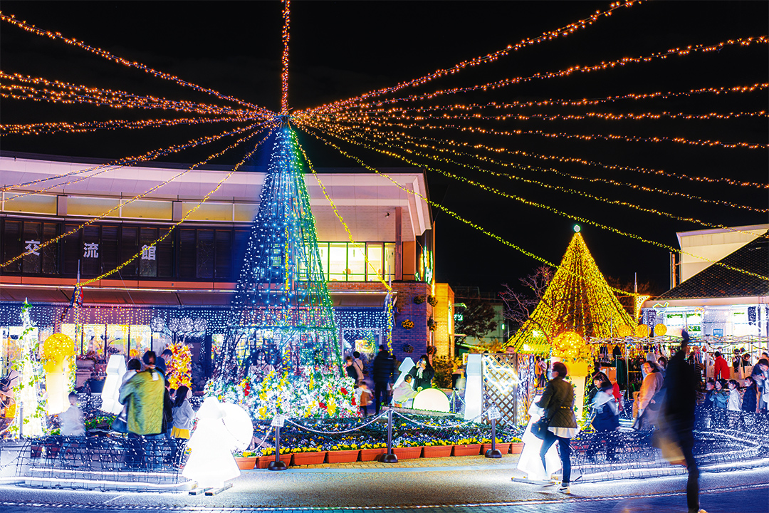 中でも、施設中央にある「ふれあい広場」のタワーから、円形に並ぶ周囲の建物に向かって放射状に広がるイルミネーションが印象的。