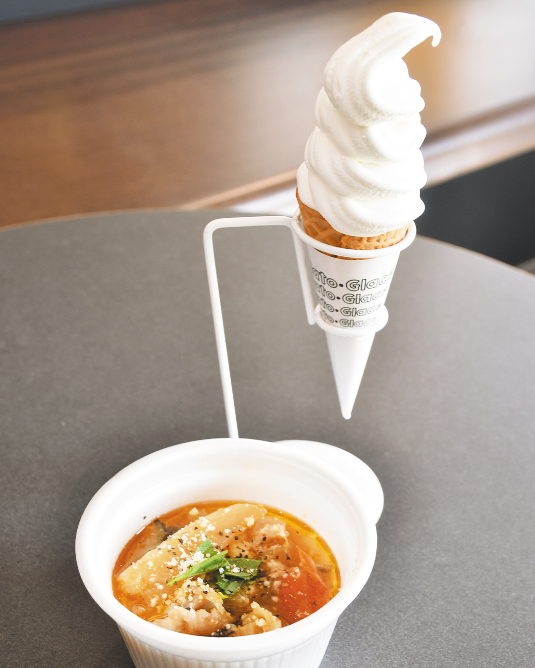 施設限定「あかぎのソフトクリーム」と「あかぎのうま豚汁 イタリア的」(写真は施設オープン日に配られた試食用)。