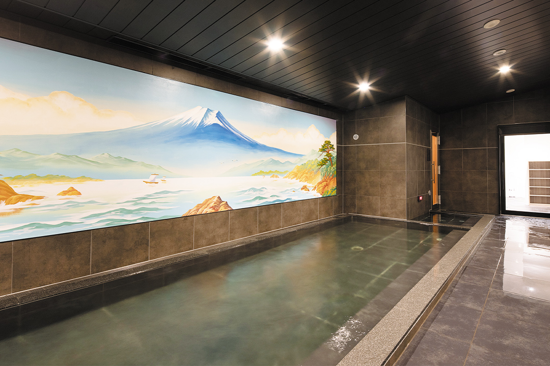 富士山が描かれた壁を見ながらくつろげる。宿泊でも日帰りでも満足できる居心地良いひとときを満喫してみて。