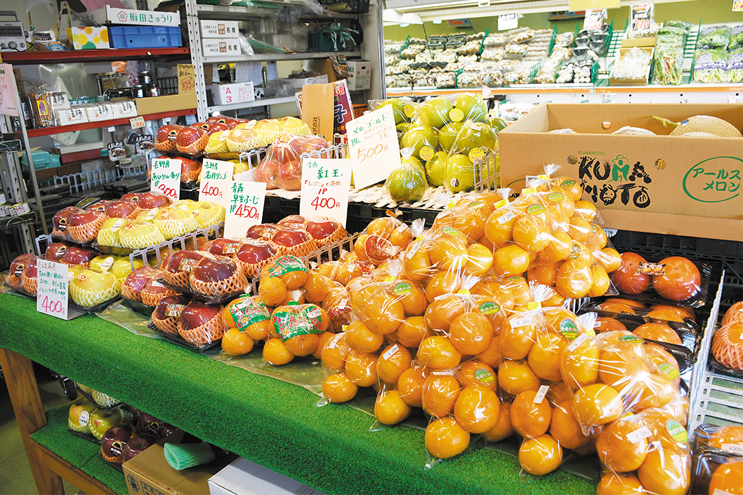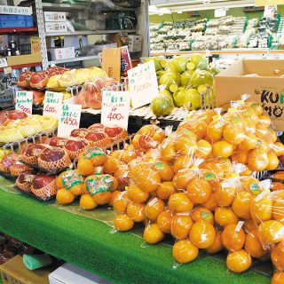 仲卸は青果2店、水産1店。「紅まどんな」など手に入りにくい果物から、お買い得のバナナまで幅広く並ぶ。