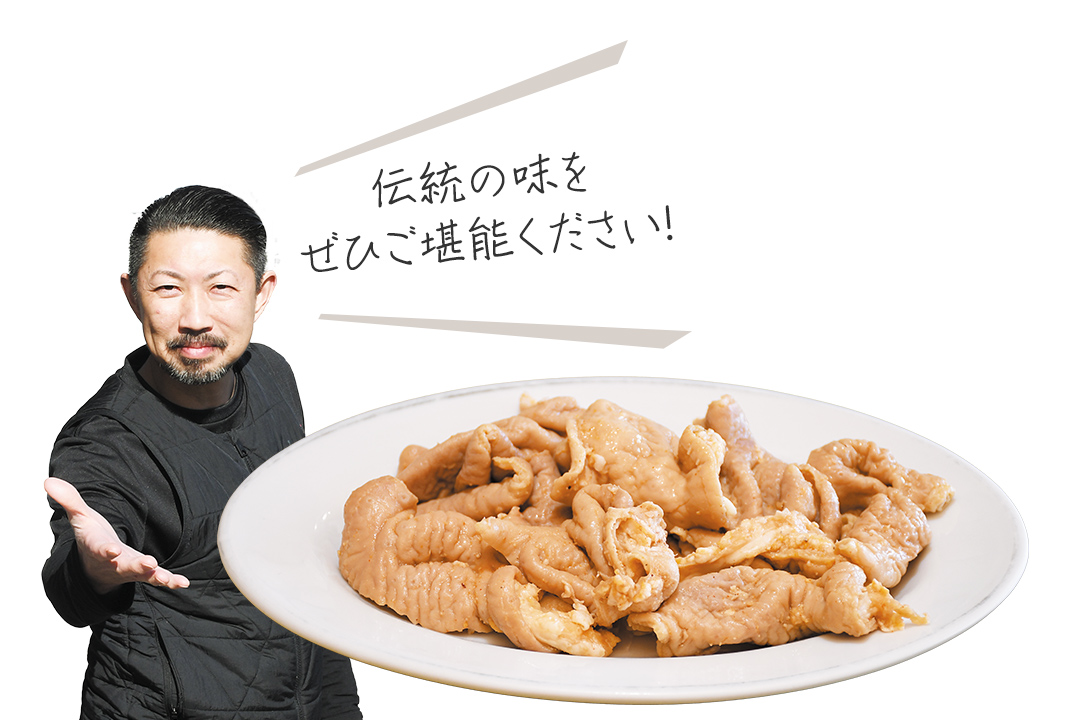 豚肉メニューを豊富に取りそろえ、中でも「豚ホルモン」は、軟らかくジューシーな食感と、代々受け継がれるみそベースのオリジナルのタレの味わいが魅力の看板メニュー。