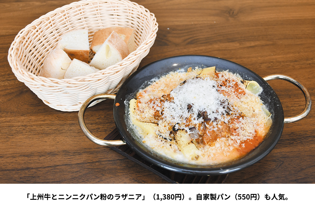 ランチの看板メニュー「ラザニア」は、上州牛のうま味を引き出したミートソース、焼き加減を調整することでソースと一体化せずに存在感を主張するパスタ、芳醇(ほうじゅん)な香りのニンニクパン粉やトマトソースなどで構成。