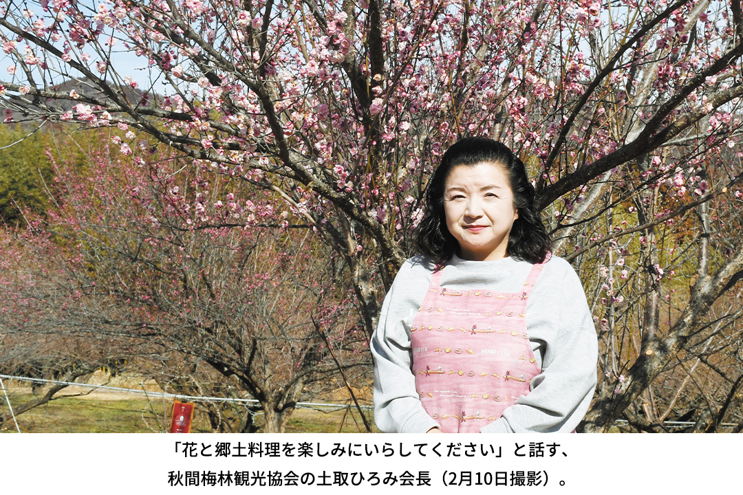 開花に合わせて開かれる秋間梅林祭は、安中市や地元観光団体が主催。週末を中心に催しが実施され、安中総合学園高校和太鼓部(2月28日、3月15日)や警察音楽隊(3月14日)のステージ、「秋間梅林マルシェ」(3月15日までの土・日曜、祝日)などが行われる。また、梅林内の店舗が、おきりこみや味噌(みそ)おでん、梅を使った料理を販売する。