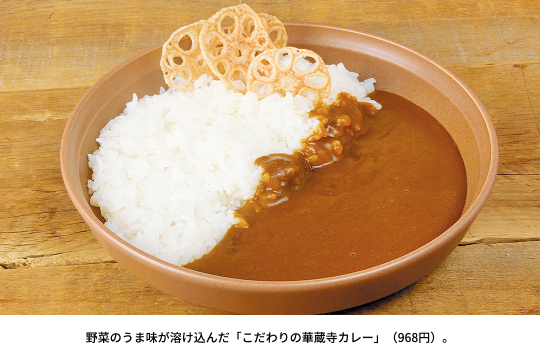 なかでも看板メニューの「こだわりの華蔵寺カレー」は、子供から大人まで満足できる絶妙な辛さを追求し、親しみやすい日本式カレーに仕上げている。