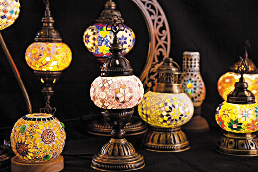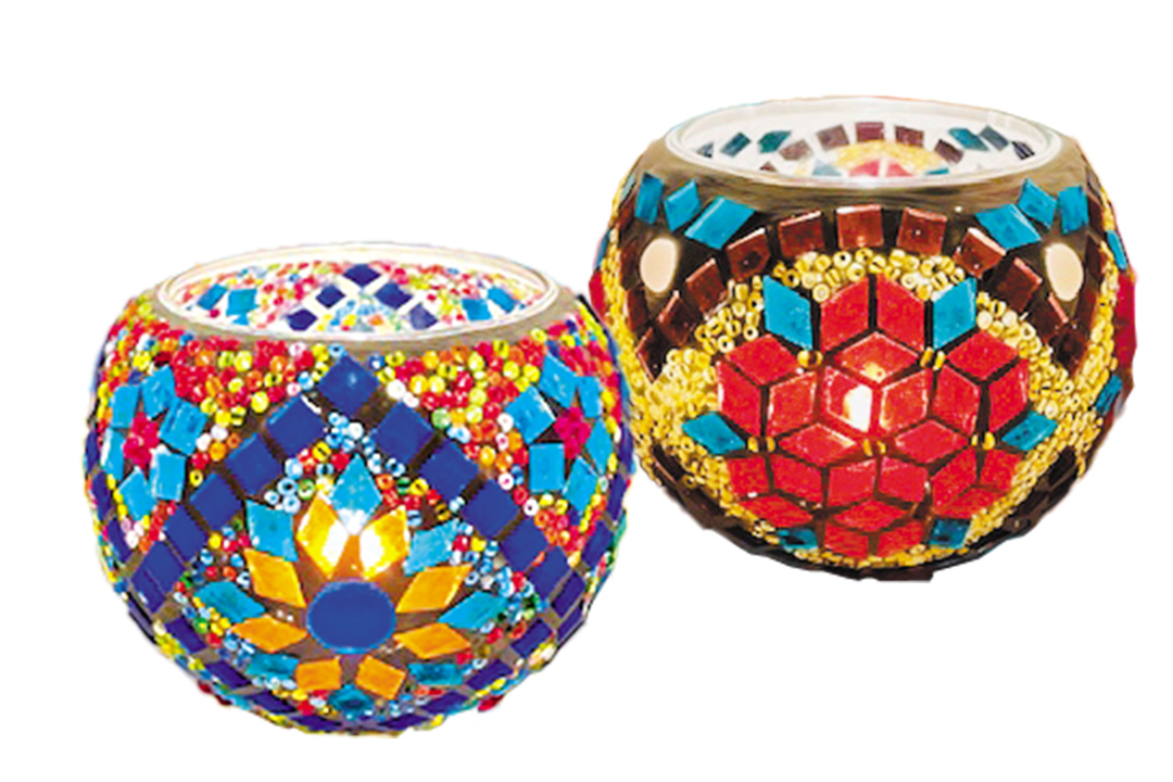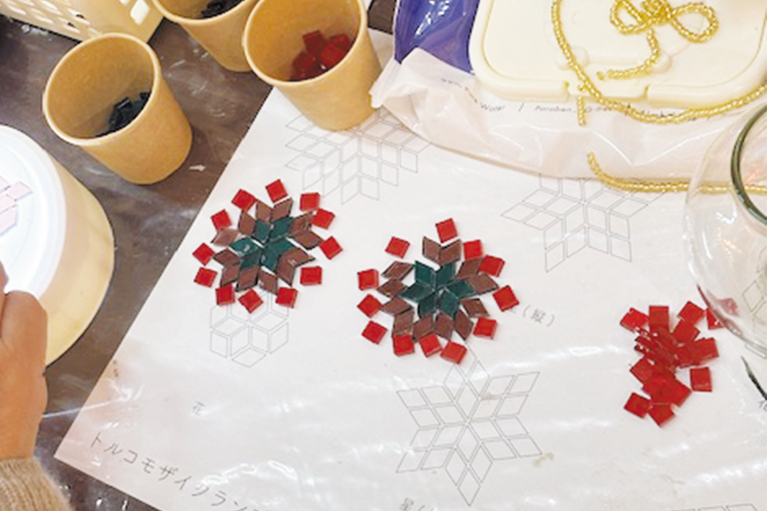 須藤さんがトルコで買い付ける色とりどりのガラスタイルやビーズを、ランプのガラス面に貼って模様を作っていく。