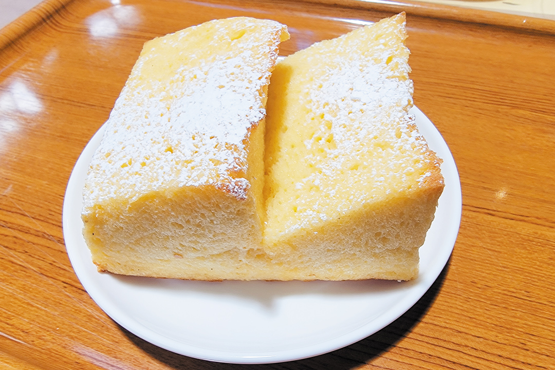 桐生を象徴するのこぎり屋根形の食パン2分の1斤にフレンチ液をたっぷり染み込ませ、外はサクッと、中はもちっと焼き上げている。