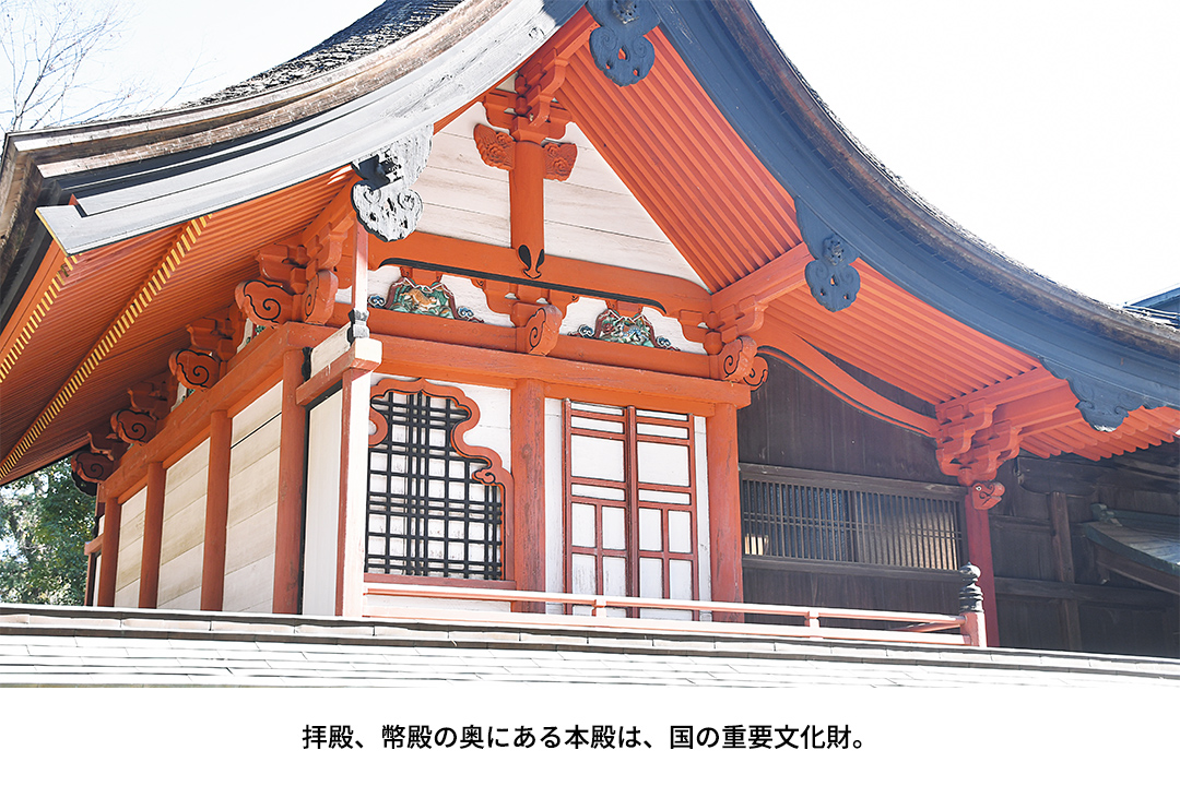 桃山時代の様式を残す本殿は国の重要文化財に、拝殿や随神門などは町の重要文化財に指定されている。