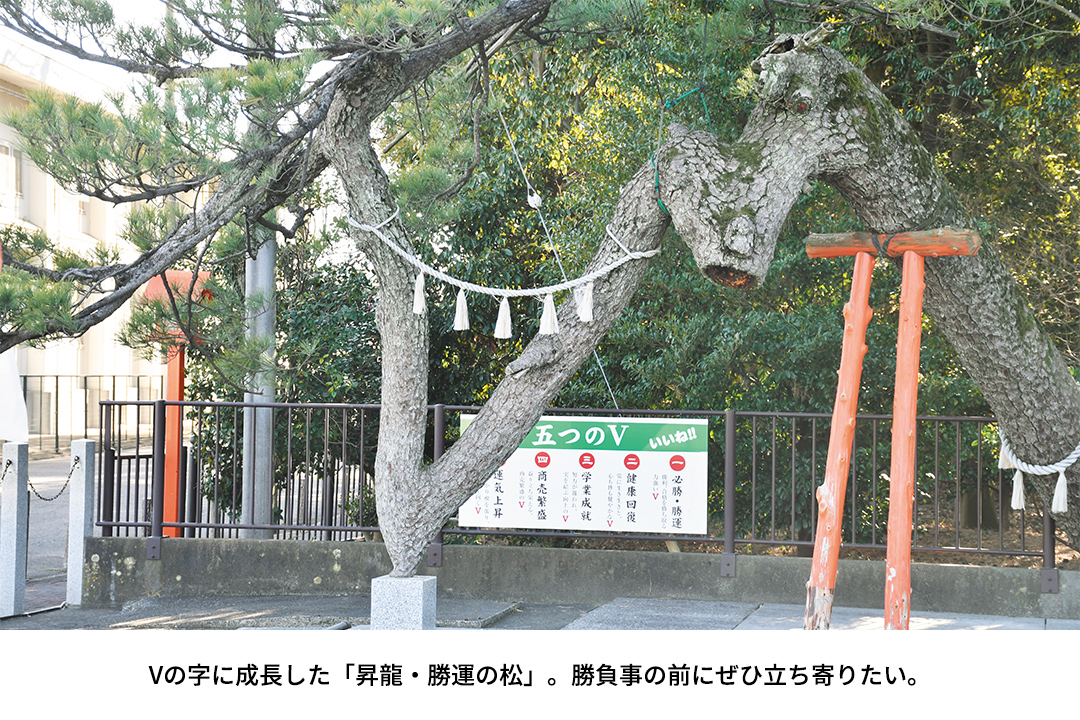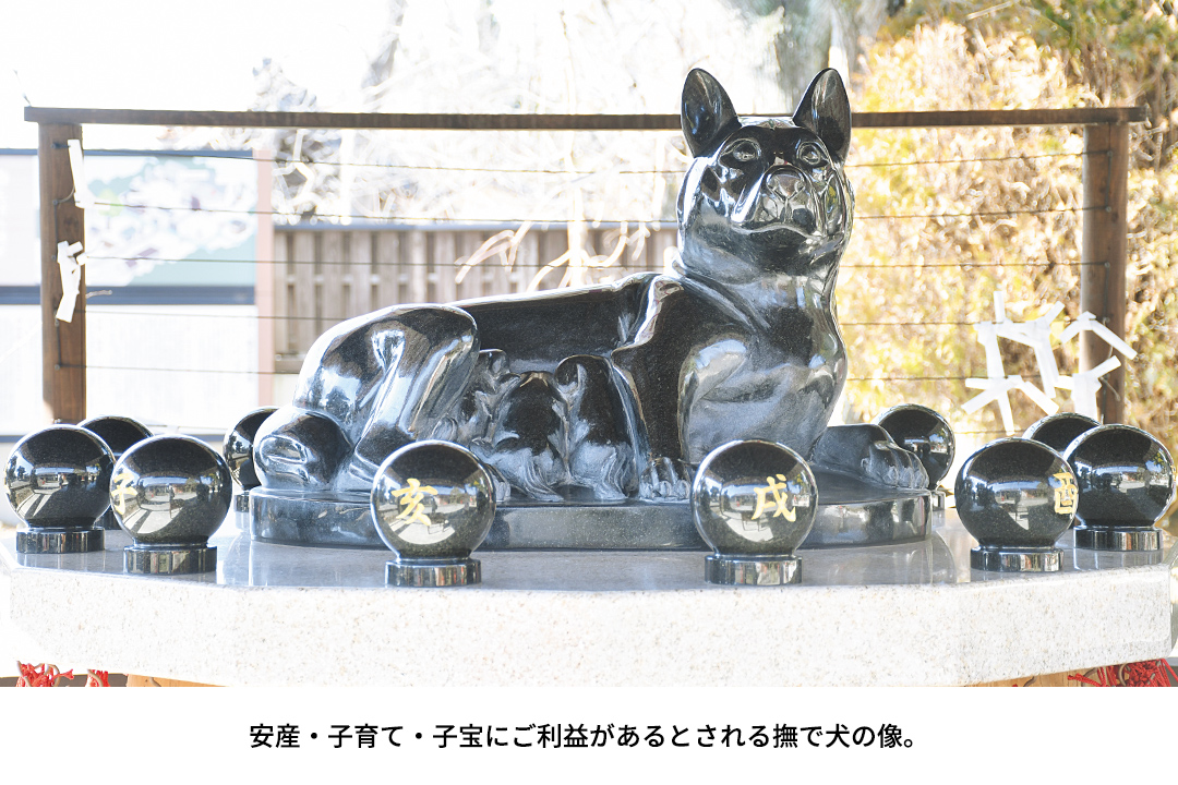 境内には安産祈願の「撫(な)で犬」や、勝利を象徴する「昇龍・勝運の松」などがある。