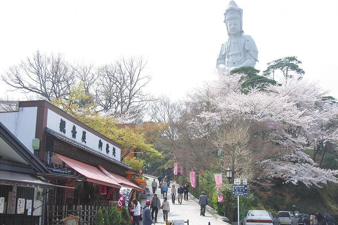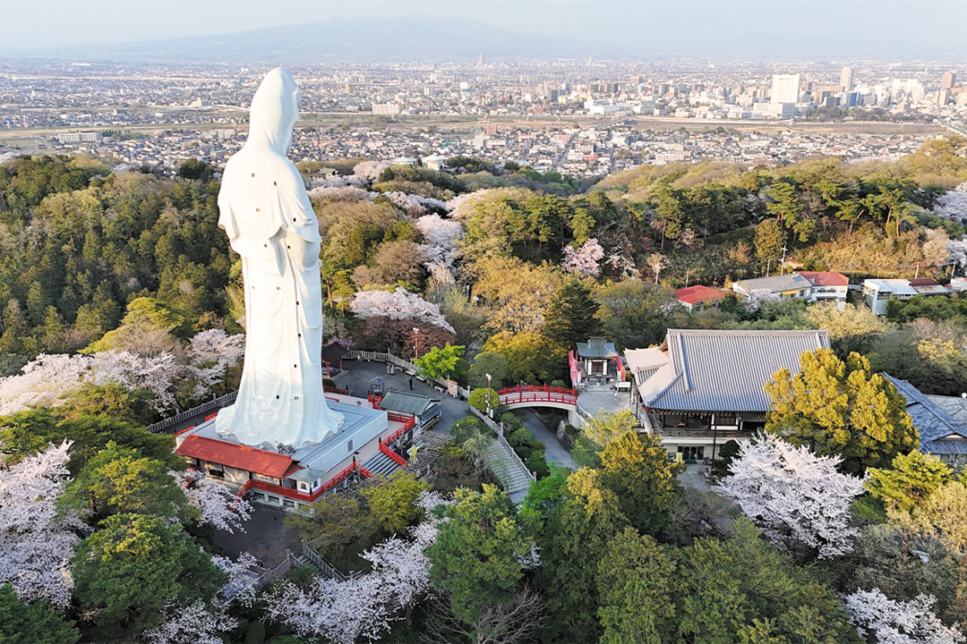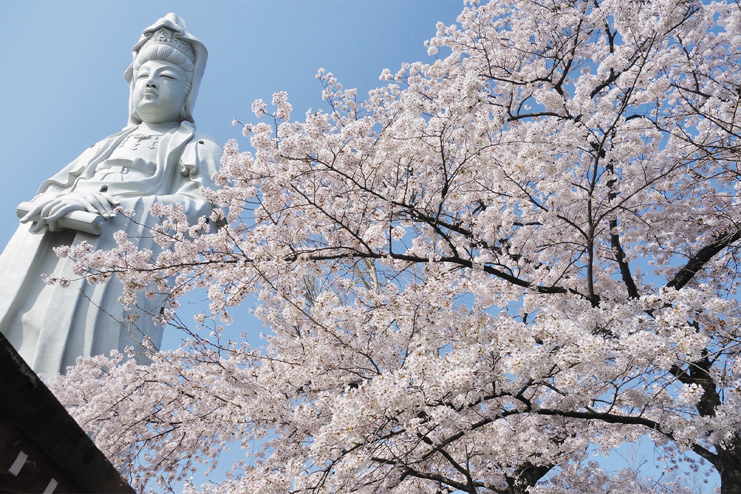 慈眼院境内にそびえる白衣大観音は胎内の拝観が可能で、窓からは桜色に染まった山を一望できる。