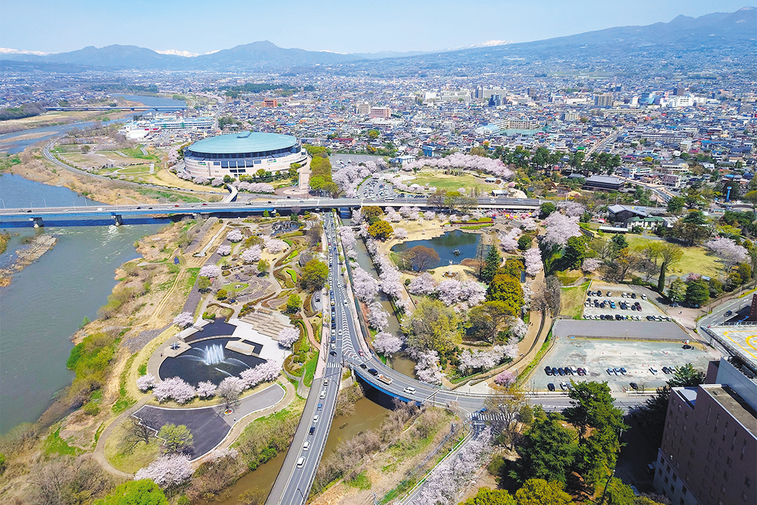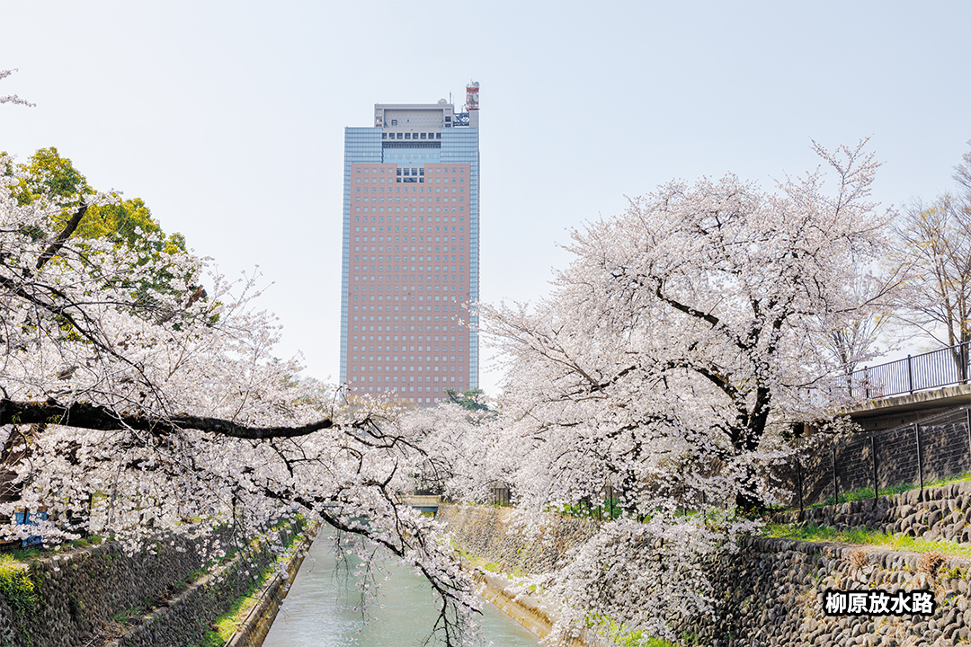 前橋市街地を代表する桜の名所、楽歩堂前橋公園。園内には約350本の桜が植えられ、北側の「みどりの散策エリア」周辺や、柳原放水路沿いを中心に園内各所が彩られる。