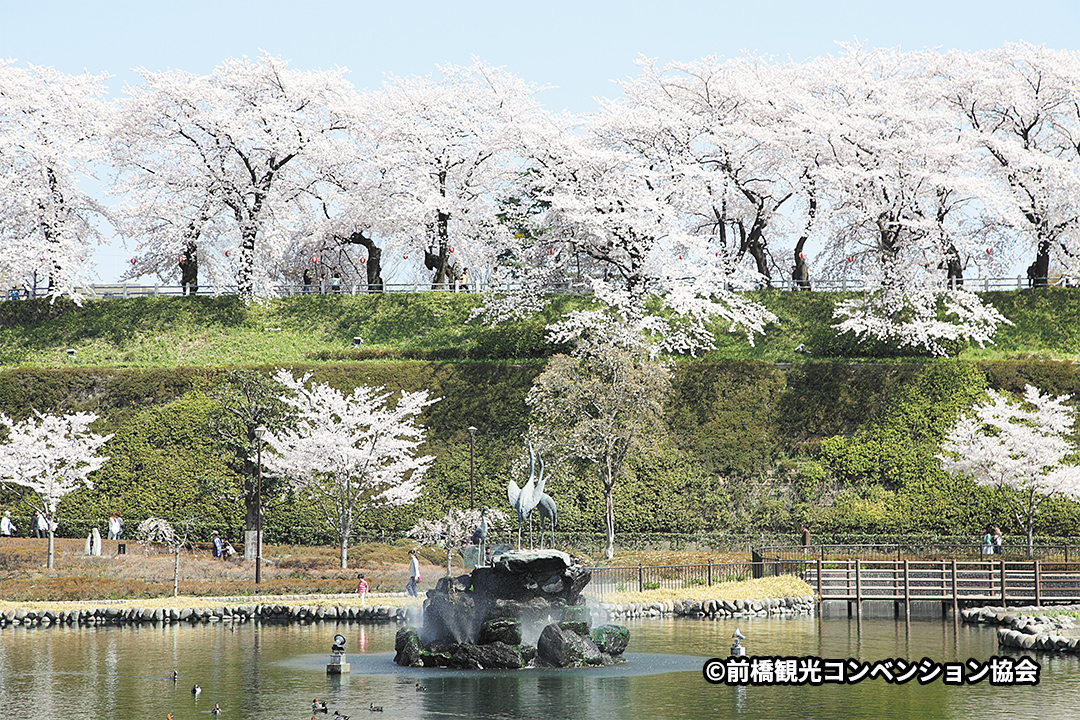 景色を楽しむだけなら自由に入ることができ、群馬県の形を模した園内の「さちの池」や、利根川、赤城山とともに、桜に彩られた公園を一望できる。