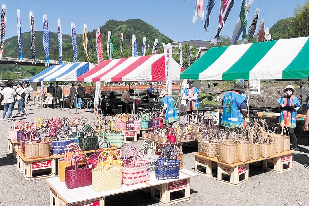 5月3日~5日はイベント開催日で、焼きそばなどの軽食、あみかごや絵はがきといった品物を販売するテントが並ぶ。