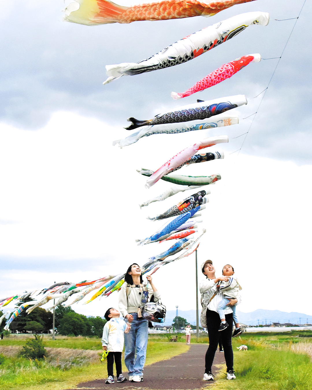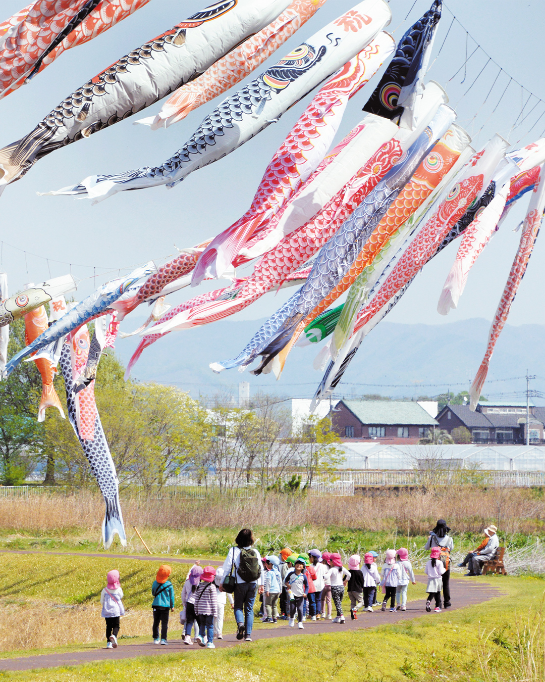 歩道に沿って頭上を舞うこいのぼりを見上げたり、川をまたいで泳ぐこいのぼりを眺めたりしながら散策しよう。