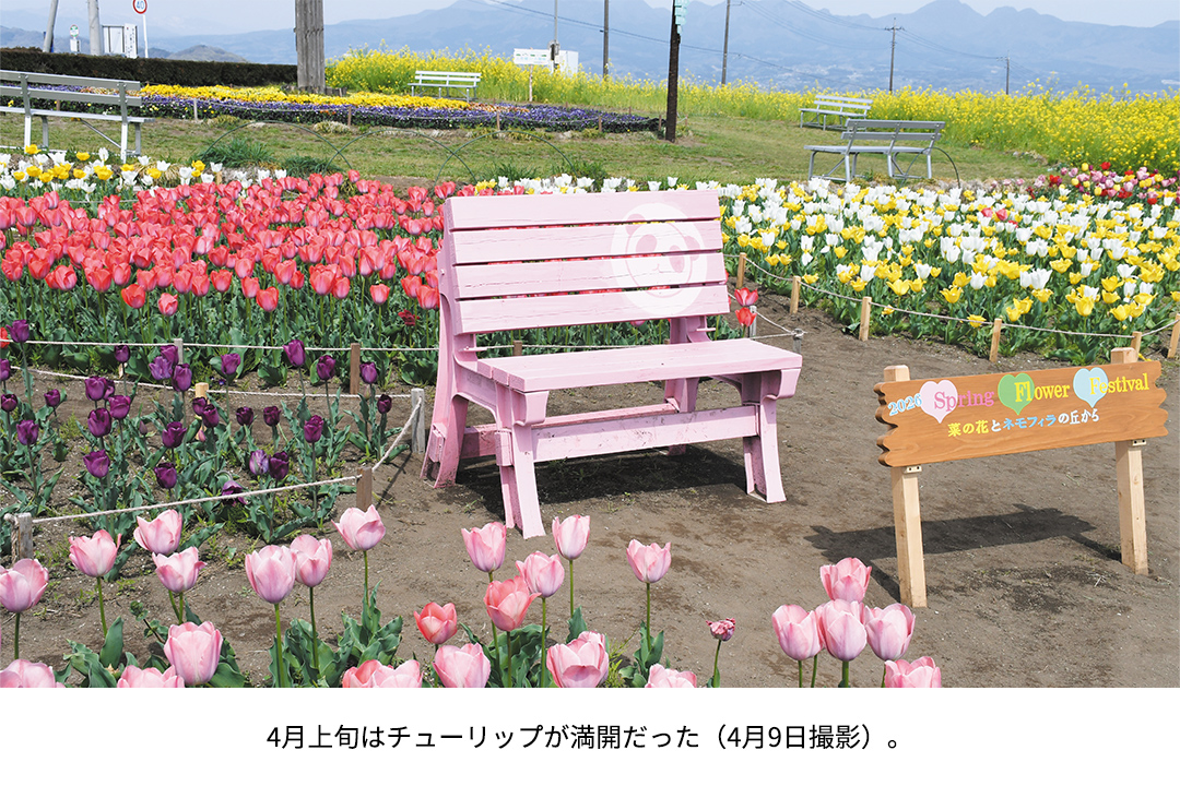 春は約30万本の菜の花をメインに、チューリップやネモフィラ、ビオラなどが咲く。