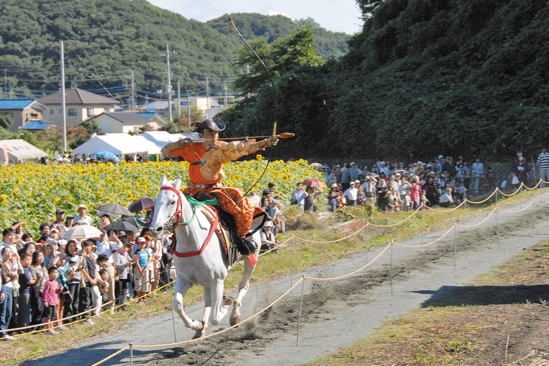 約20万本のひまわりの見頃に合わせ、ステージイベントや、馬上から弓矢で的を射る「笠懸の武技」(11日13時)などを行う。
