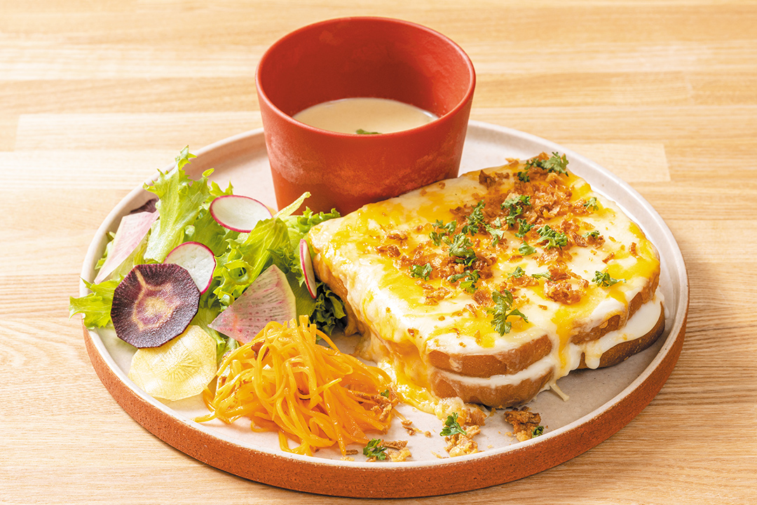 フレンチをベースにしながら重くなりすぎない料理を提供し、モーニングは地元の人に親しまれている老舗「アジアパン」の食パンを使ったトーストサンド、ランチはメイン料理と雑穀米のプレートなどがメニューに並ぶ。