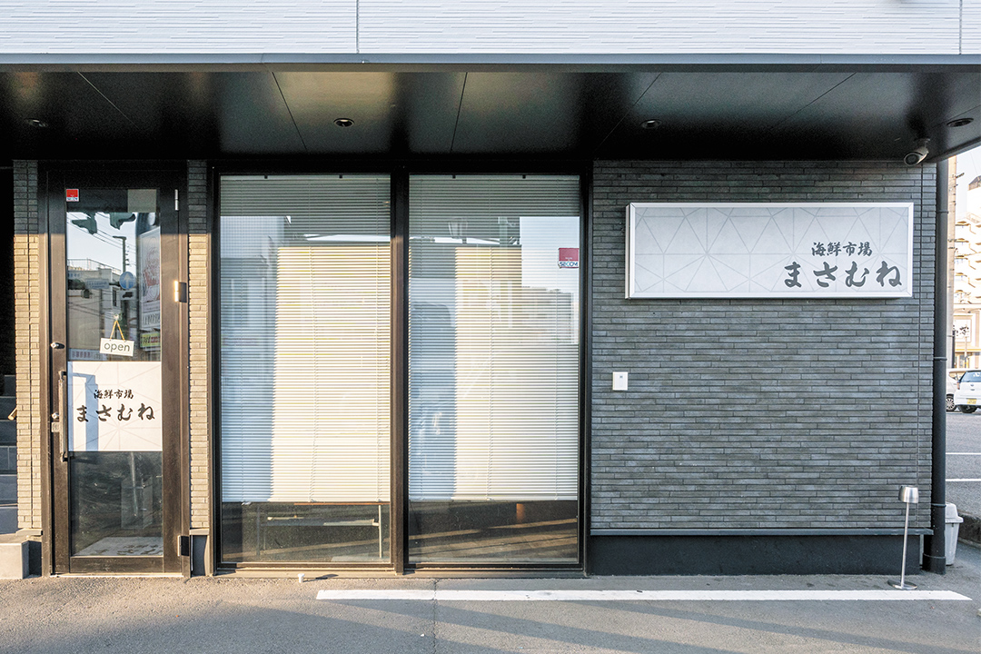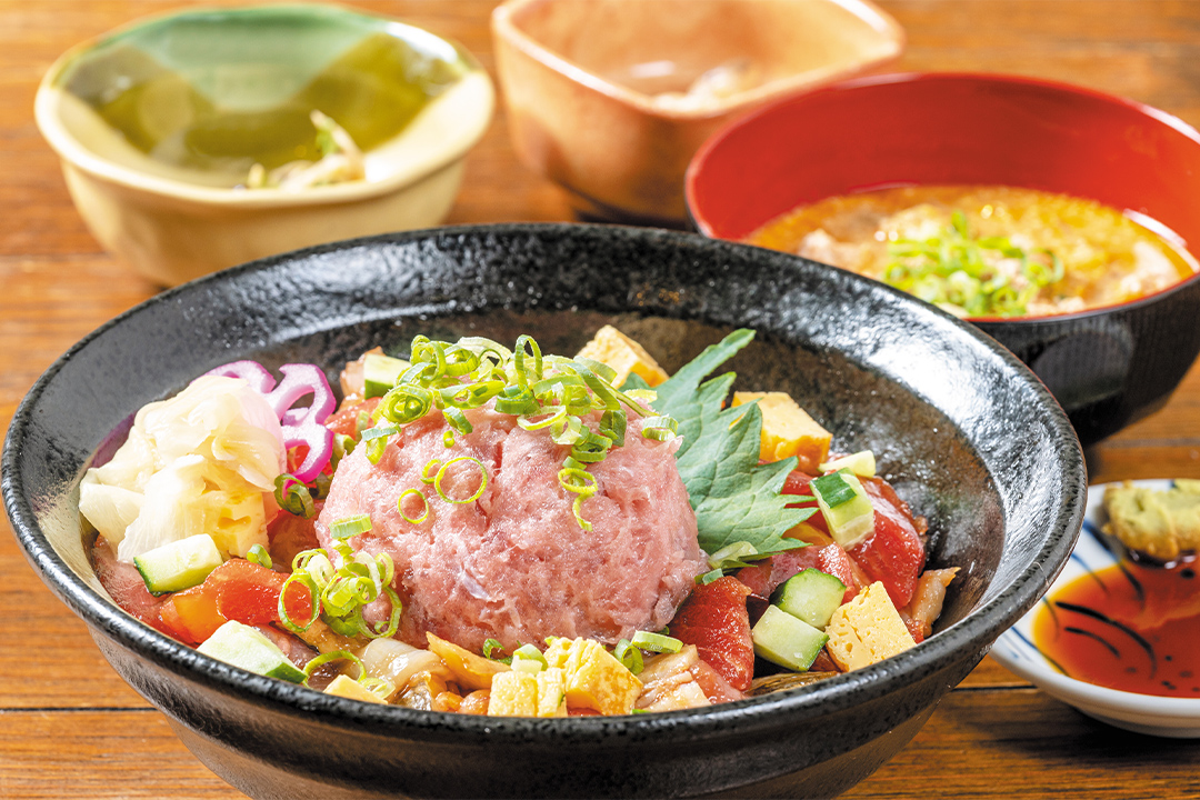 ランチのおすすめは、マグロやタイ、サーモン、エビ、旬の魚など、5~6種類の切り身をちりばめた華やかな「まさむね丼」。
