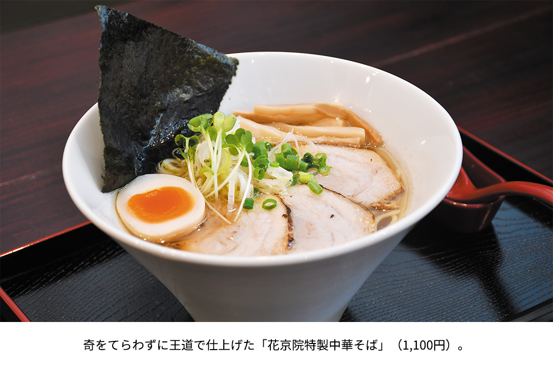 看板メニューの「花京院特製中華そば」は、昔ながらの中華そばを洗練させ、だしの深みと醬油(しょうゆ)の香りを際立たせた渾身(こんしん)の一杯だ。