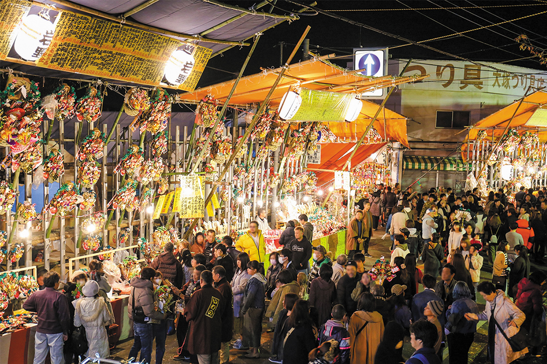えびす太鼓や太々神楽の奉納、抽選会などを行うほか、周辺道路にお宝や熊手などの縁起物を販売する露店が立ち並ぶ。