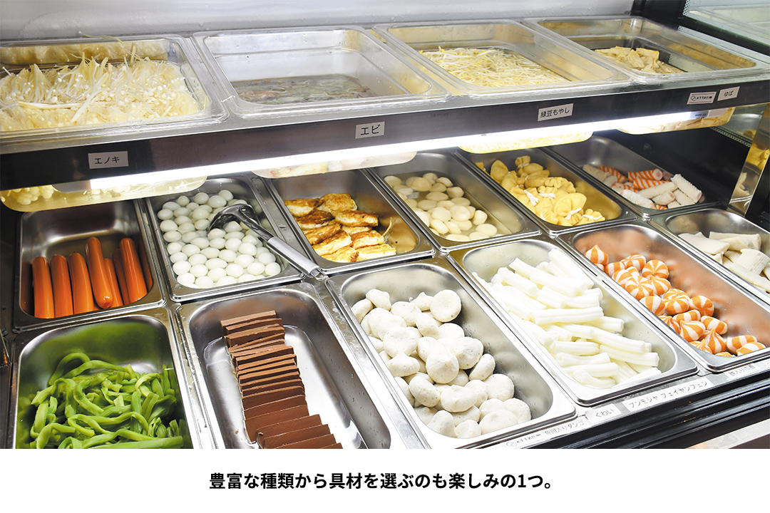 ショーケースから好きな麺と具材を取り、スープを選んで調理してもらうスタイルだ。