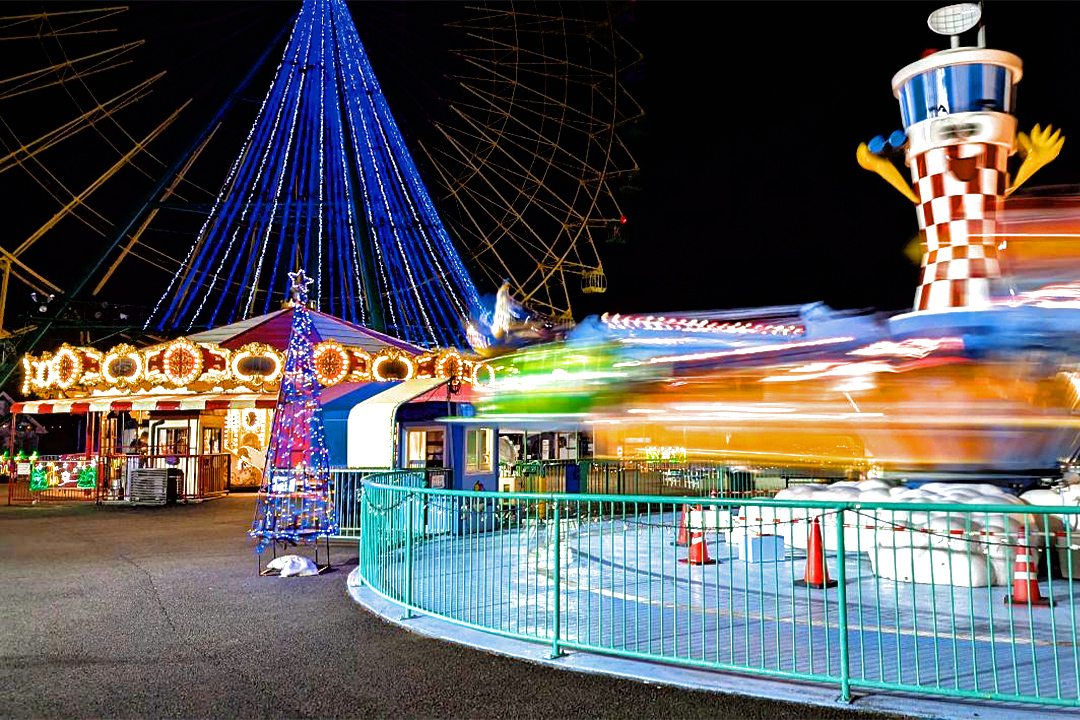 期間中は夜間開園し、観覧車の中心軸から伸びる約35mのツリーや各種ライティングで園内を彩る。