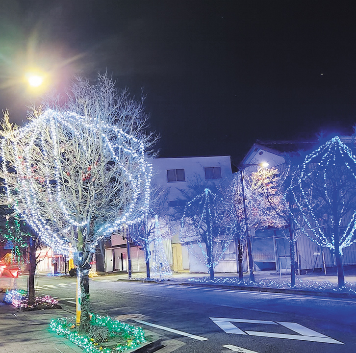 駅前通りの約360m間の街路樹と新町ふれあい公園が約3万球のLEDで輝く。