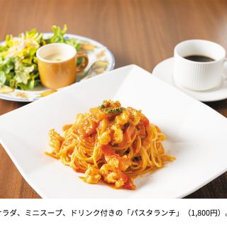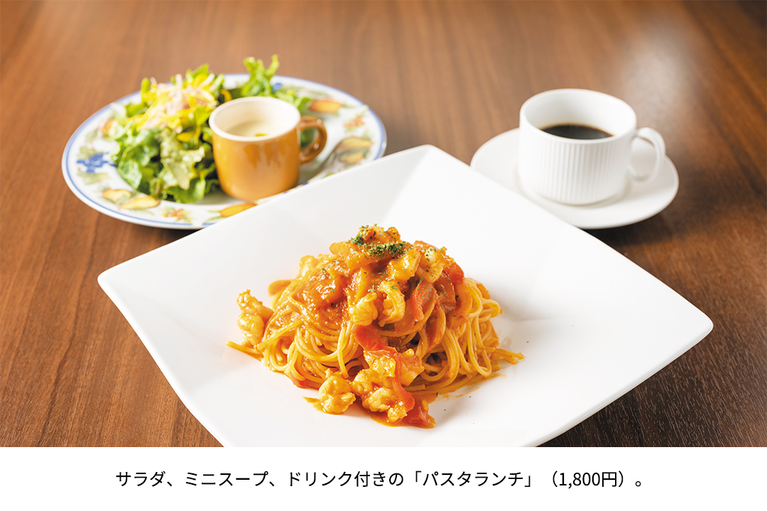 一番人気の「パスタランチ」は、サラダとミニスープ、ドリンクが付いたセットで、パスタはトマトやオイル、クリームなどの6種類から選べる。