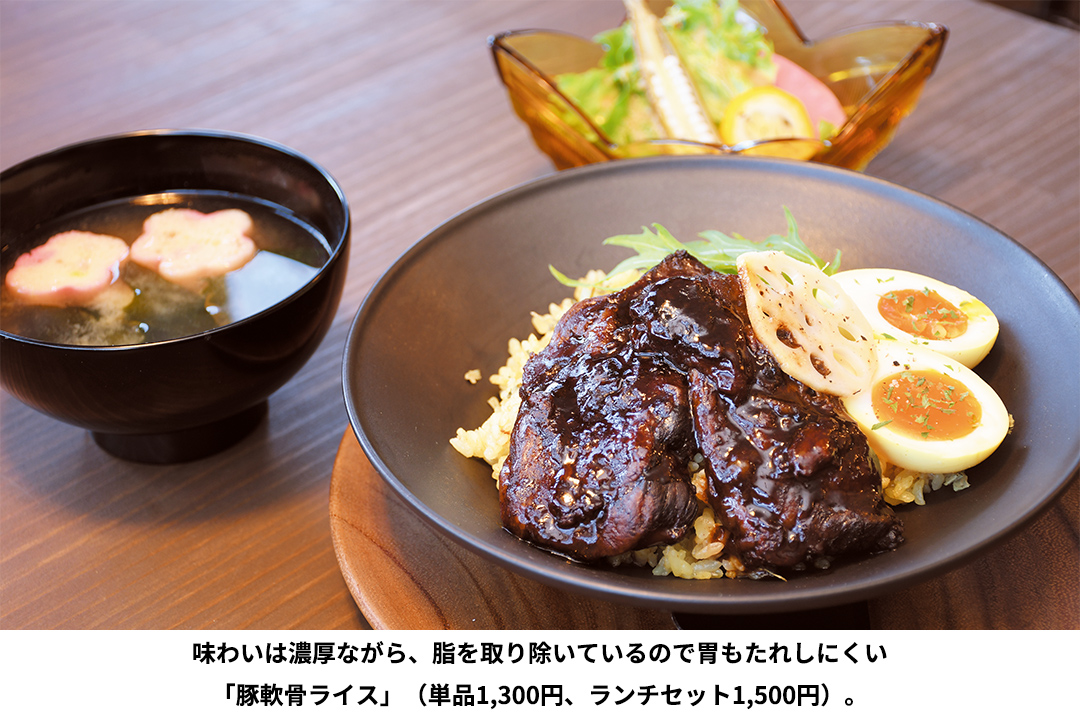 ランチでは看板メニューの「豚軟骨ライス」を提供。赤ワインでトロトロになるまで煮込んだ豚バラ軟骨肉を、スパイシーなガーリックライスや付け合わせの自家製ピクルスが引き立てる。
