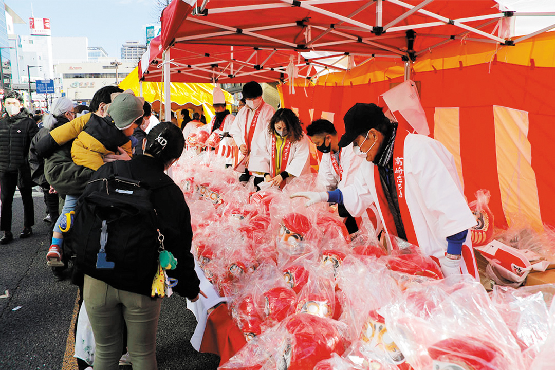 大小さまざまな「高崎だるま®」を初め、カラーだるま、干支(えと)だるまなどを販売する約50店が集合する。