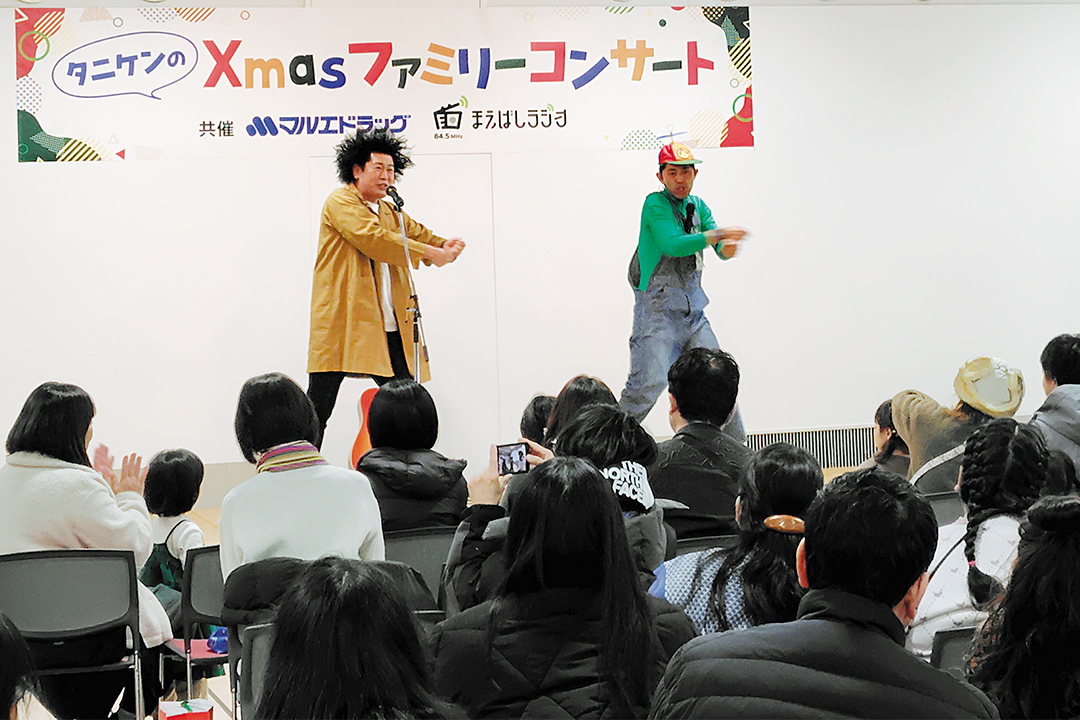 歌手・谷本賢一郎と、子供向けエンターテイナー・せきあっしがステージでパフォーマンスを披露する。